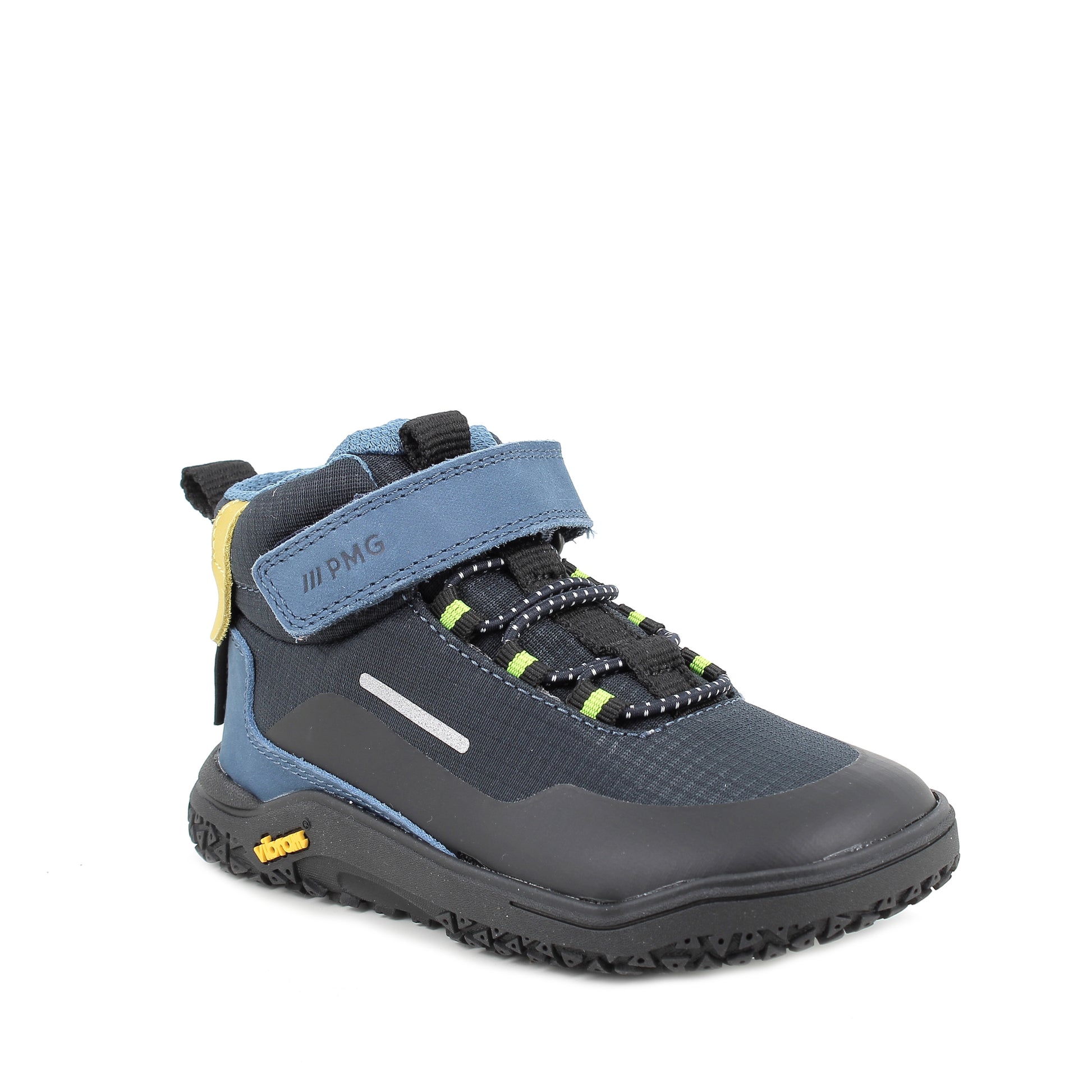 Bota BAREFOOT PRIMIGI GORE-TEX en color negro y azul con PUNTERA REFORZADA. La suela, de caucho de alta calidad, incluye la tecnología VIBRAM de excelente resistencia a la abrasión, gran durabilidad, tracción y agarre en todo tipo de terrenos. El CIERRE es de VELCRO y CORDONES ELÁSTICOS